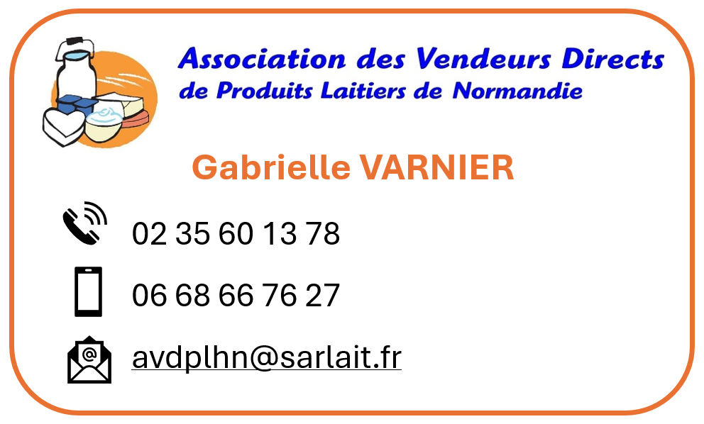Association des Vendeurs Directs de Produits Laitiers de Normandie : L’A.V.D.P.L Normandie Nous contacter Pour toute question, n’hésitez pas à contacter l’animatrice de l’association : Où nous trouver ? 321 Rue des Champs CS 20071 76233 Bois-Guillaume Cedex Partager :Cliquez pour partager sur Twitter(ouvre dans une nouvelle fenêtre)Cliquez pour partager sur Facebook(ouvre dans une nouvelle fenêtre)Cliquer pour imprimer(ouvre dans une nouvelle fenêtre)